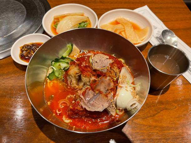 Le mul naengmyeon est un plat froid de bouillon de nouilles de riz composé de courgettes, d’œuf dur et de sésame. Si son aspect semble peu appétissant, vous serez surpris de son goût. C’est pourquoi il est conseillé de le goûter et de ne pas se décourager à votre première impression.