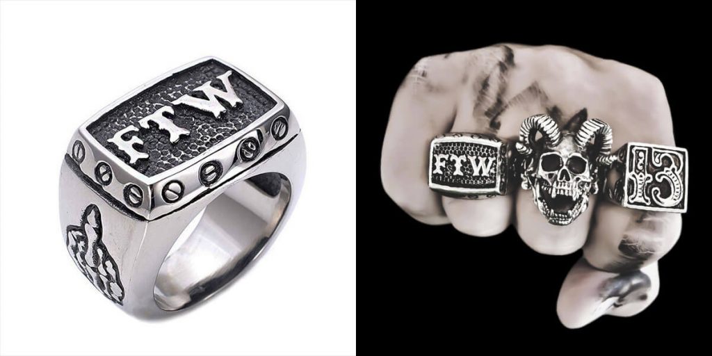Il existe aussi des motifs comme les armes, les chaines et les animaux pour symboliser le danger. Aucune règle ne régit le port des bagues Bikers, porter une ou plusieurs bagues sur la même main n’est pas interdit. Au contraire, avoir plusieurs bagues alignées sur les doigts d’une même main est très utile pour produire le coup de poing américain en cas de bagarre de rue.